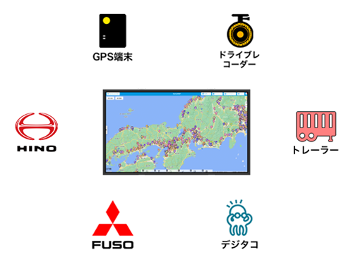 業界最少クラスサイズの小型GPS端末やGPS内蔵の通信型ドライブレコーダー、トラックに搭載されているコネクテッド連携、トレーラ専用端末からデジタコまで、様々なGPSデバイスに対応しておりますので、ご利用される環境・用途に適したデバイスを選んでご利用いただけます。
