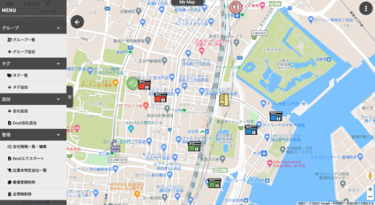 DoCoMAP上に表示させたい住所の登録をして、表示させることが可能です。また、グループを作成することもできるため、顧客様登録だけでなく待機場所などの登録にも活用できます。