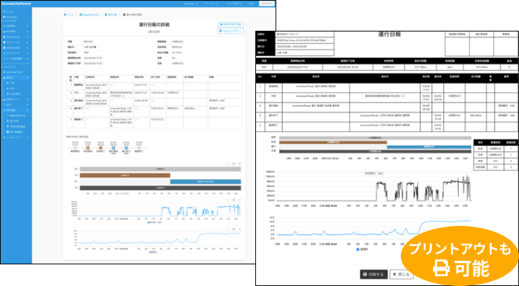 1日の労働時間、付帯作業時間や走行距離などが分かりやすい帳票にて印刷も可能ですので管理も容易になります。