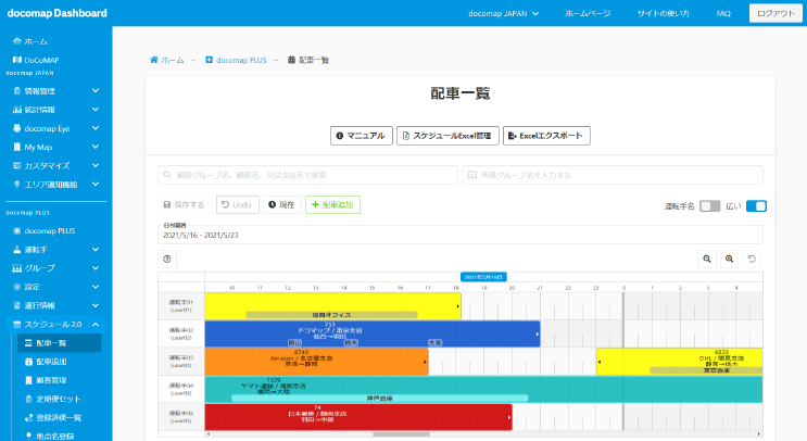 車両のスケジュールを登録し、地図上で確認することができます。また、 スケジュールの内容をグループとして登録ができるので定期便などのスケジ ュール登録に役立ちます。