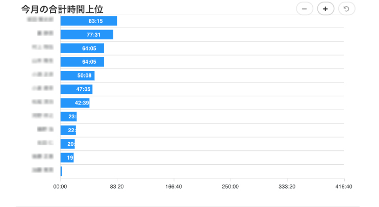 当該月のPLUS利用者の拘束時間を上位順で確認することができます。上位利用者が常に確認できるので、長時間労働を防ぐことが可能となり、改善基準告示に遵守することができます。