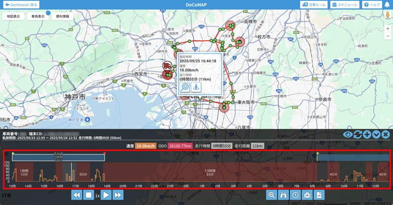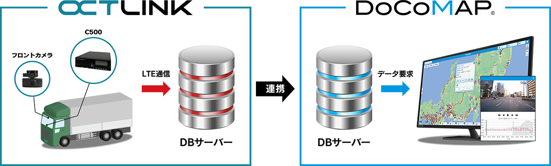 OCTLINK端末に搭載された、Gセンサーと車速パルスによる正確な速度検知で「急減速」「急加速」「急ハンドル」「速度監視」等の危険挙動閲覧が実現しました。また、カメラを連携している場合は、危険挙動の動画をDoCoMAP上でいつでもご確認いただけます。