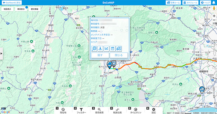 docomapPLUSは、DoCoMAPと連携することで、 車両の位置情報と連動した運行状況をリアルタイムでクラウドに記録・ 管理することを可能にするスマートフォン向けアプリケーション。 更に、OCTLINKと連携することで、PLUSアプリとOCTLINK本体のボタン操作が連動し、デジタコの入力補助装置としてご活用いただくことも可能になります。 入力いただいた内容をもとに自動で運行日報を作成することも可能です。